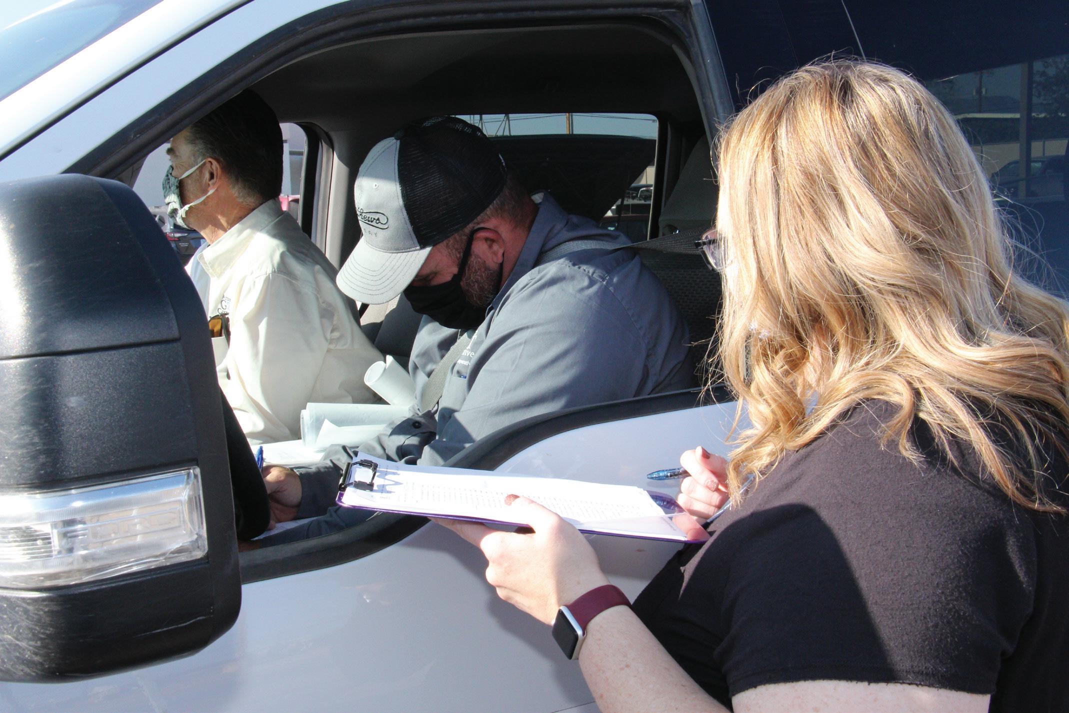 Robert Bivens receives a flu shot from Michael Harrington during the drive-up clinic at the Benson campus. Apache Station employees received free flu shots during a similar clinic the day before at the Apache Station.
