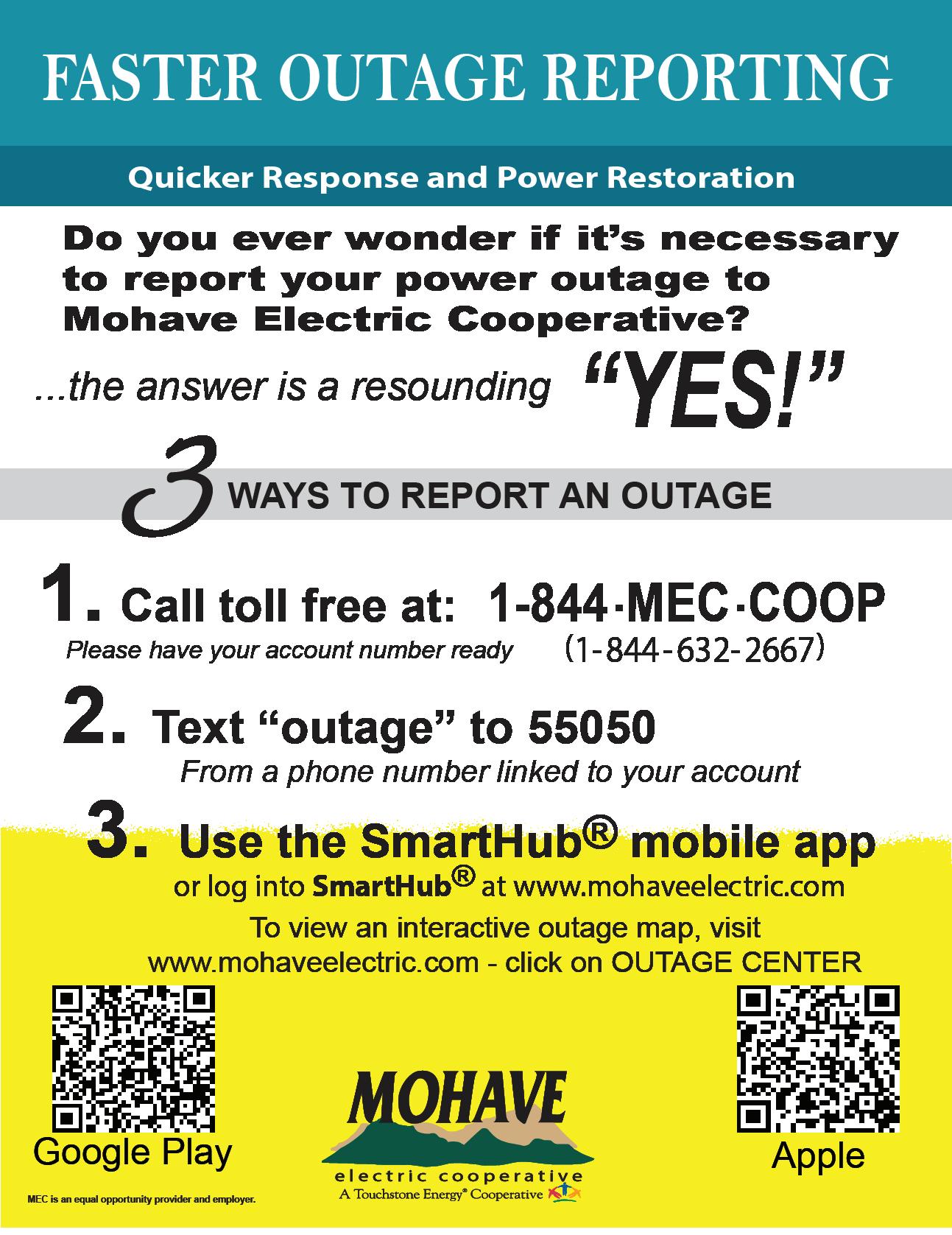 Calling 844-MEC-COOP (844-632-2667) is a fast way to report an outage and is most effective when members use the outage-reporting number from a phone number listed on your Mohave Electric account.