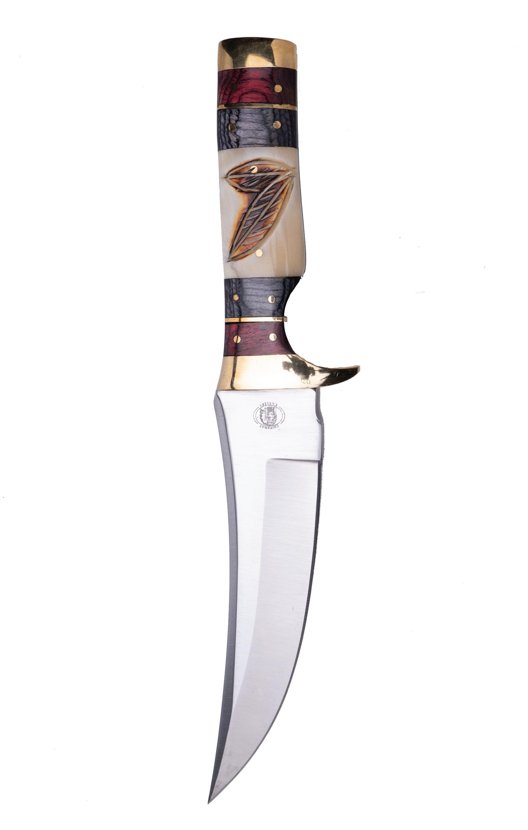 The handle is made from genuine natural bone, and features decorative wood spacers and a hand-carved motif of two overlapping feathers— a reminder for you to respect and connect with the natural world.