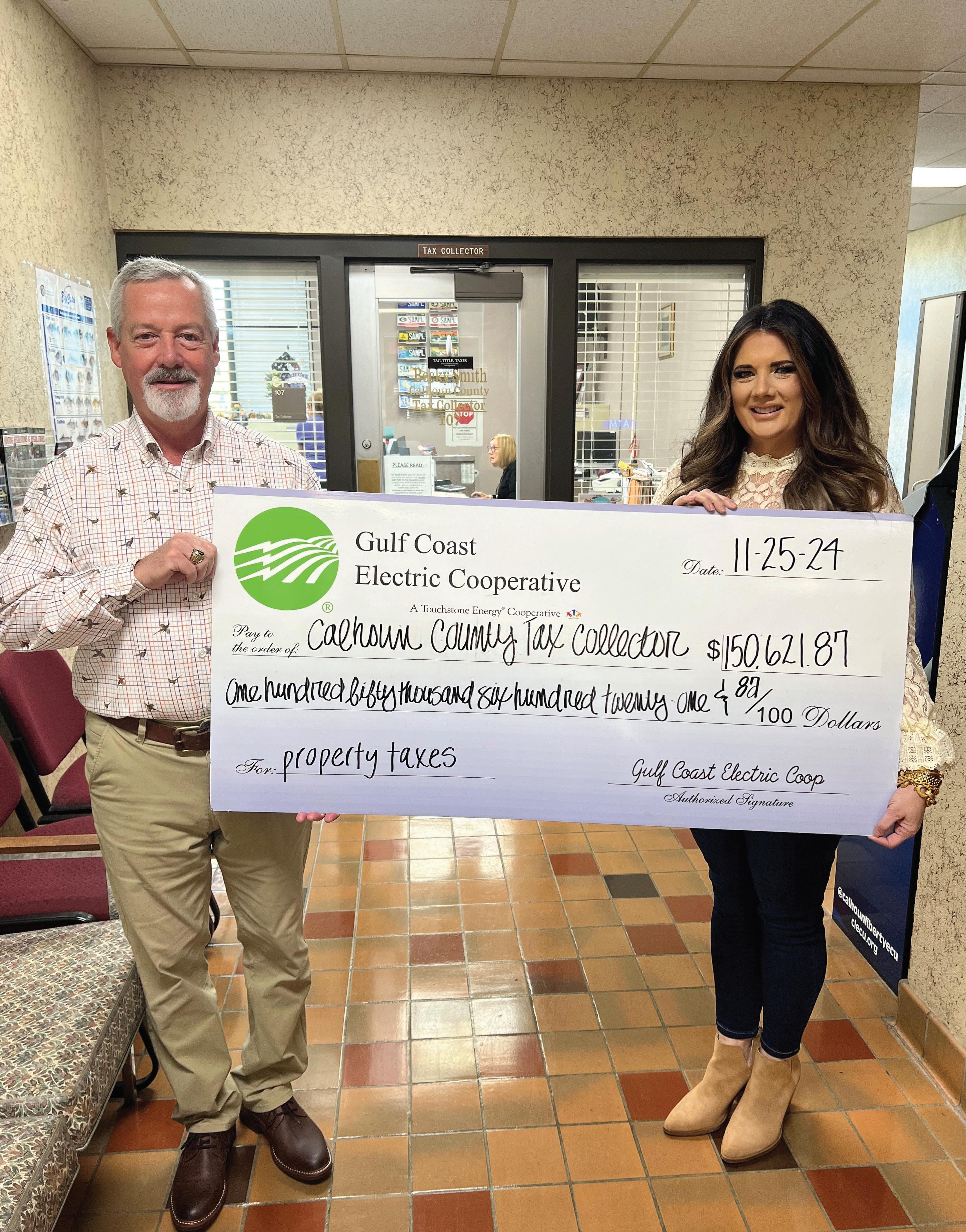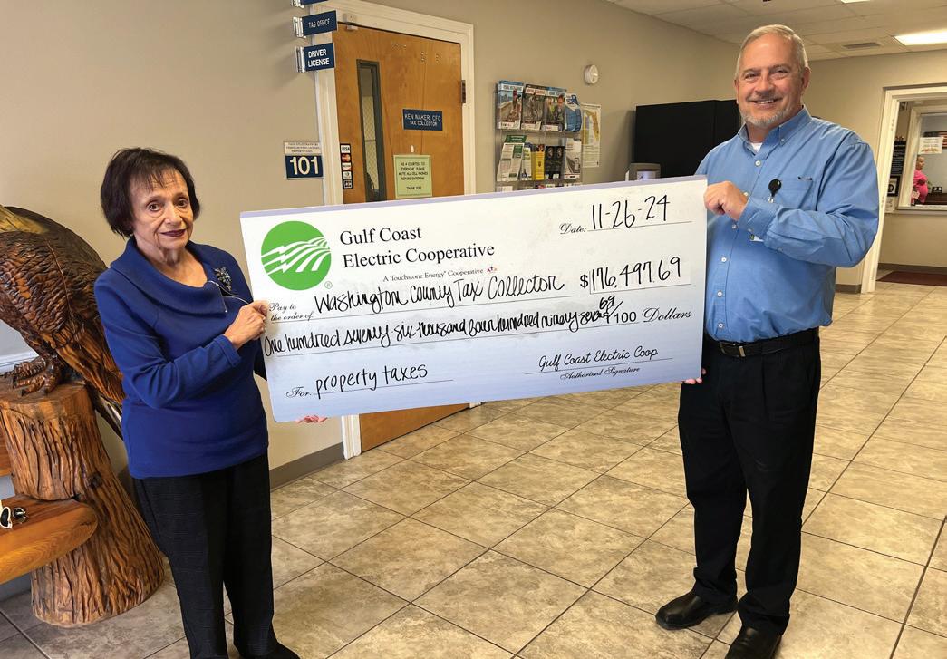 Gulf Coast Electric Cooperative District 1, Group 2 Trustee and President Dwight Van Lierop, left, pays property taxes on behalf of the cooperative to Chris Rogers of the Calhoun County Tax Collector’s Office, right. Read more on Page 8.
