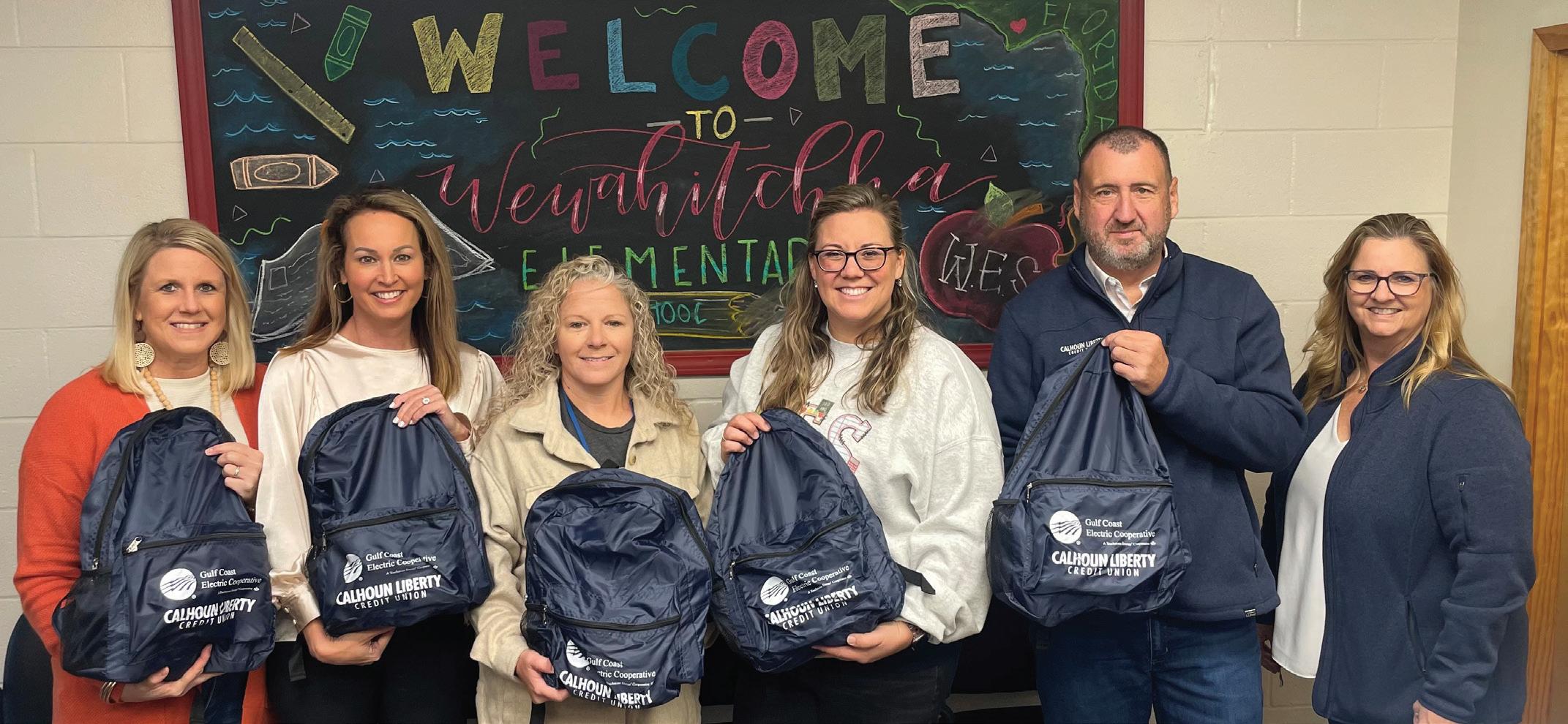 From left, Wewahitchka Elementary School Principal Jennifer Guffey, Gulf Coast Electric Cooperative Vice President of Marketing and Communications Kristin Douglas, Wewahitchka Elementary School Principal Designee Stephanie Bailey, Wewahitchka Elementary School Guidance Counselor Jessie Pippin, Calhoun Liberty Credit Union CEO Thomas Flowers and Calhoun Liberty Credit Union Chief Operating Officer Teri Waldron hold up backpacks filled with food that will be distributed to local students, helping ensure they have meals during the Thanksgiving break.