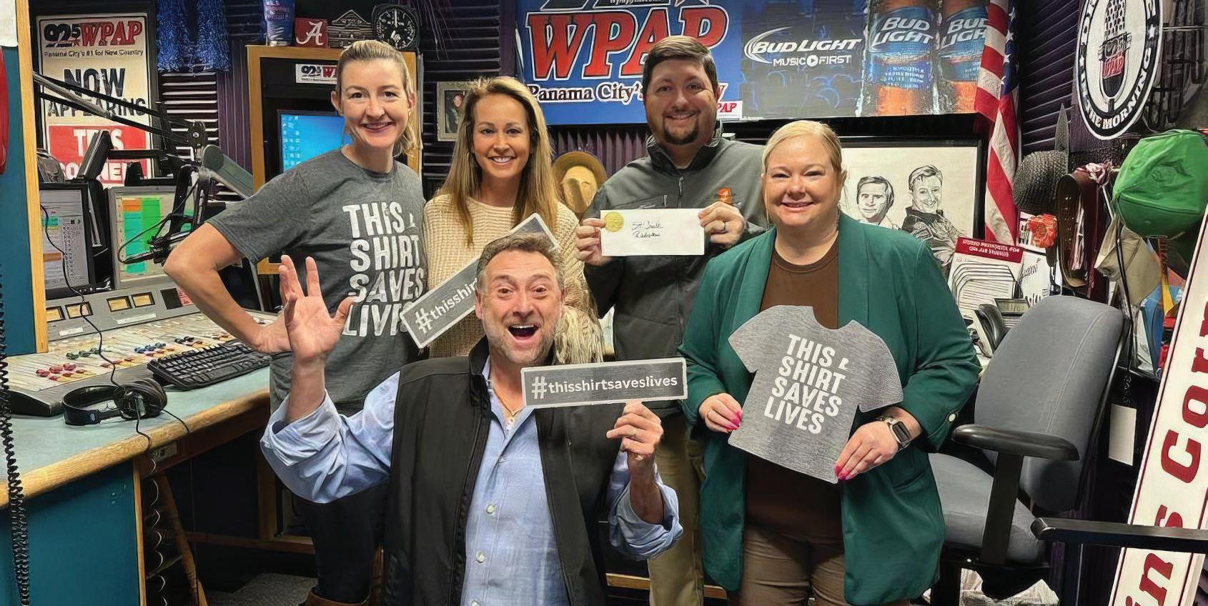 92.5 WPAP Country Cares St. Jude Kids Radiothon. Presenting an on-air donation are Kristin Douglas of Gulf Coast Electric Cooperative, back row, second from left; Tyler Wood of CHELCO, back row, third from left; and Candace Croft of West Florida Electric Cooperative, far right. Accepting the donation are Tess Connell, left, and Shane Collins, front, of 92.5 WPAP.
