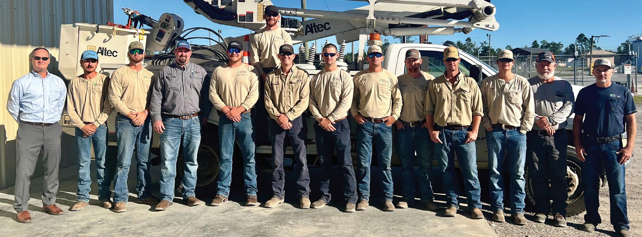 Gulf Coast Electric Cooperative CEO/General Manager John Bartley, left, stands alongside lineworkers Logan Richard, Austin Green, Wesley Newsome, Shane Kriser, Hunter Jenks, Taylor Hammack, Jay Shiver, Jace Tolbert, Mason Moses, Frankie Bailey, Luke Sowell, Hal Walden and Chad Flowers. Matthew Fleming makes repairs to Clay Electric Cooperative’s distribution system following Hurricane Milton. John Bartley addresses the group. Employees from Creamer’s Tree Service, who accompanied GCEC employees, remove trees from lines in CEC’s service territory.