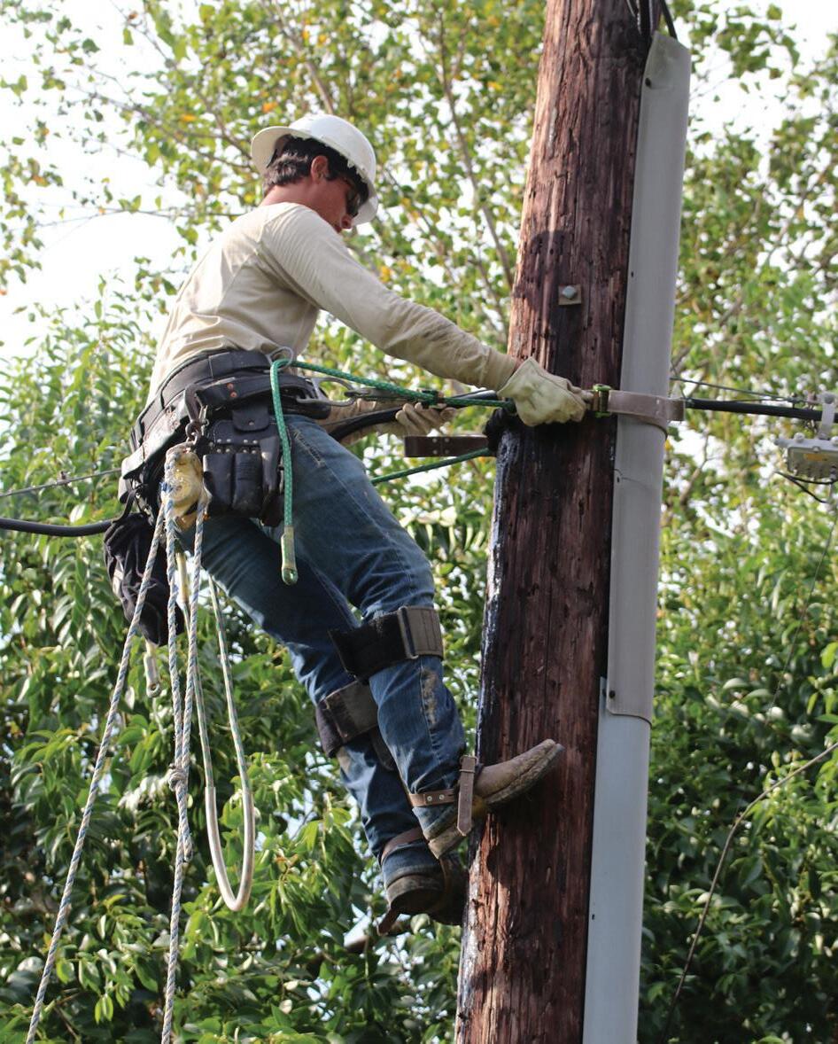 • Lineworkers wear a safety harness to prevent falls while climbing poles or working in a bucket.