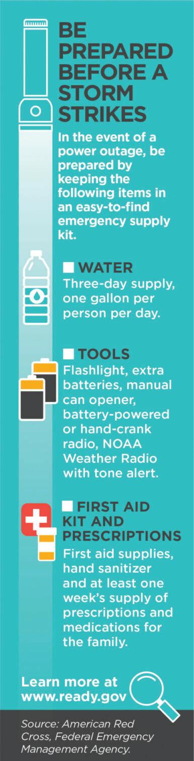 Have a plan in place and get the family involved. Gather the items listed on the graphic on the right and be sure everyone knows where the items are stored.