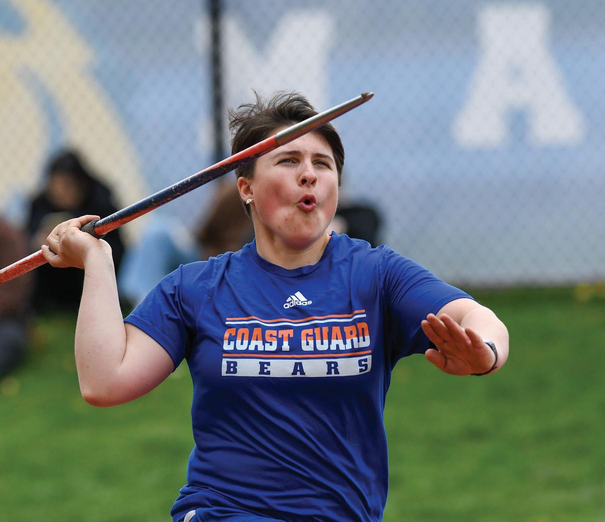 TOP: Sadie competes in javelin for the Coast Guard Bears. PHOTO BY PAUL DUDDY