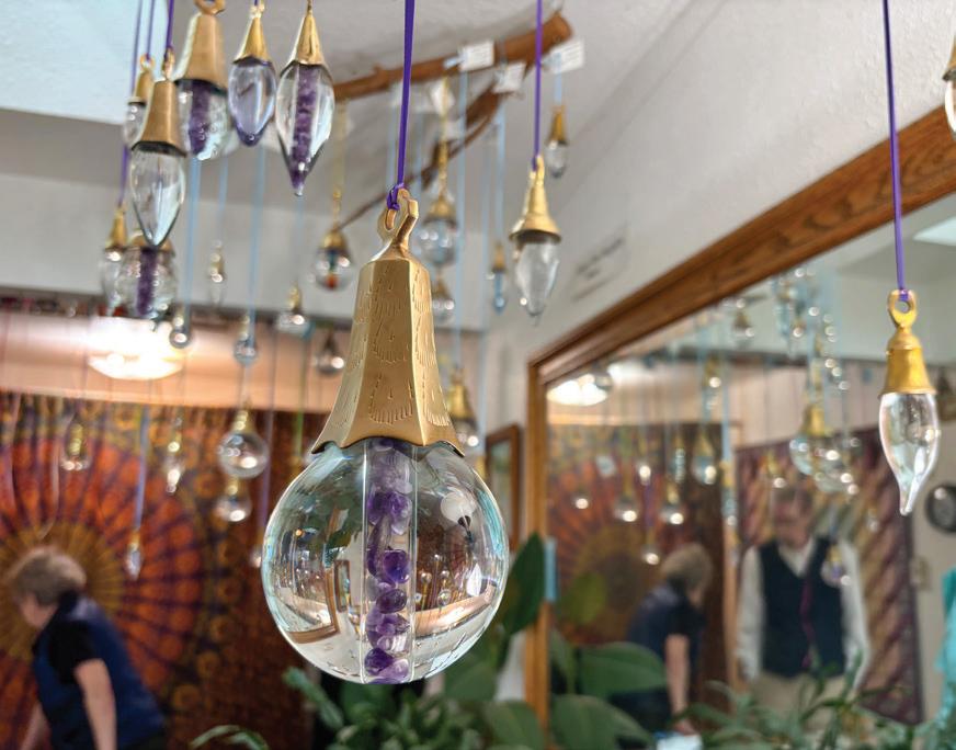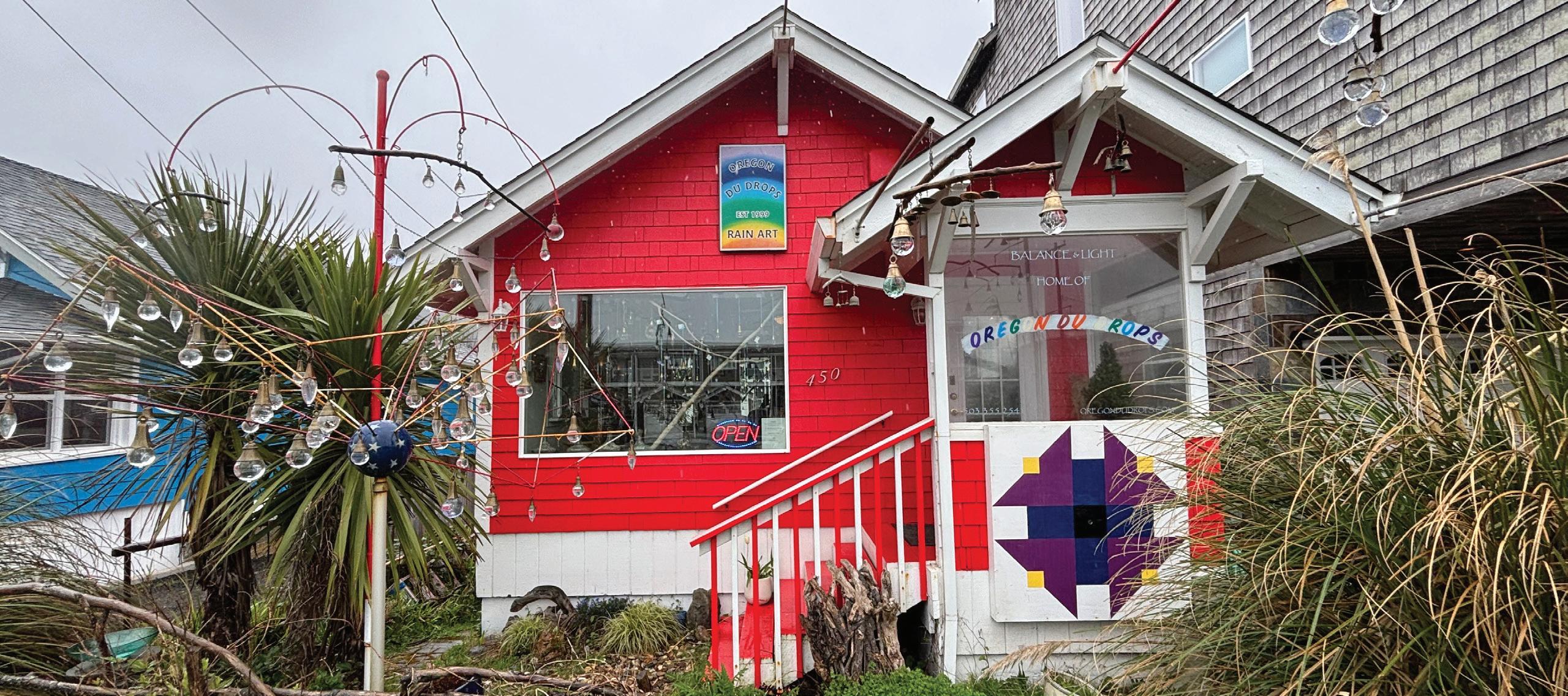 Inside a Rockaway Beach gallery off U.S. Highway 101, tiny water worlds dangle overhead. Delicate glass bulbs filled with Oregon rain and topped with brass temple bells hang like droplets suspended in time.