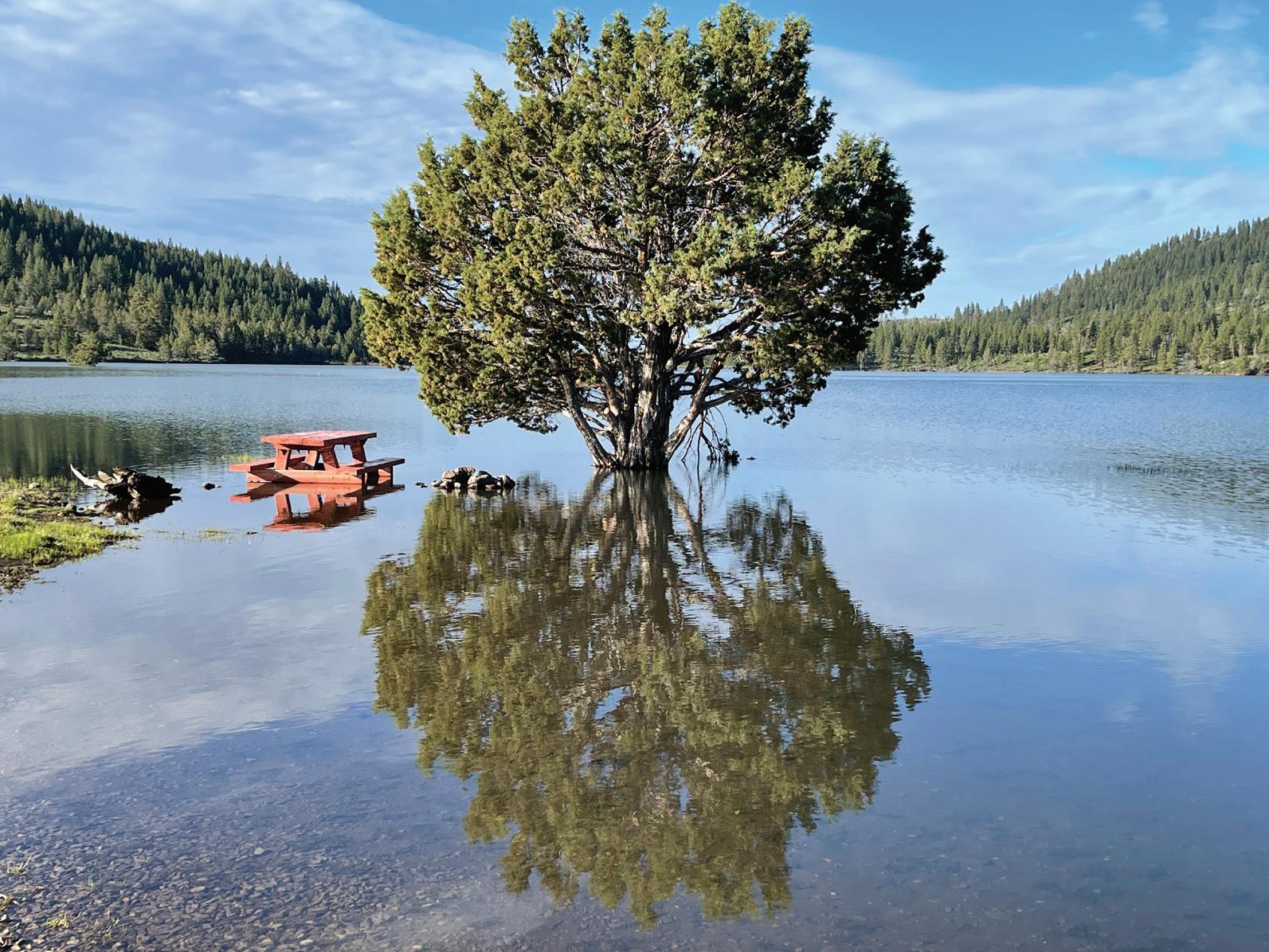 A tree’s reflection shows on the water at Lower Cottonwood Reservoir in Lakeview, Oregon.