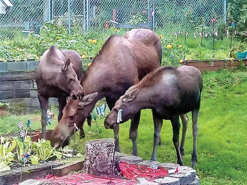 “‘Moose-sensitive plants are behind the tall chain-link fence, but this year, I discovered they also like Swiss chard,” Anita Hartmann says after a mother moose and her twins visited her garden.