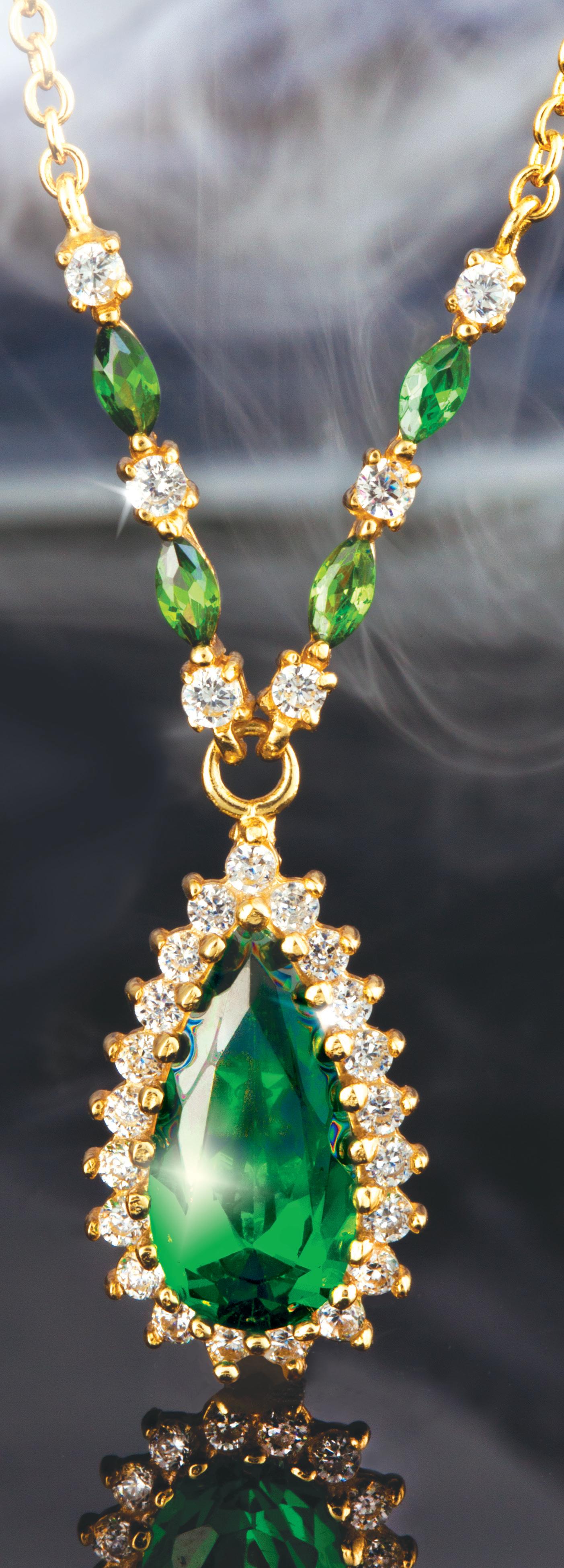 Known as America’s emerald, Helenite makes it possible to give her a stone that’s brighter and has more fire than any emerald without paying the exorbitant price. In fact, this many carats of an emerald that looks this perfect and glows this green would cost you upwards of $80,000. Your more beautiful and much more affordable option features a perfect teardrop of Helenite set in gold-covered sterling silver suspended from a chain accented with even more verdant Helenite.