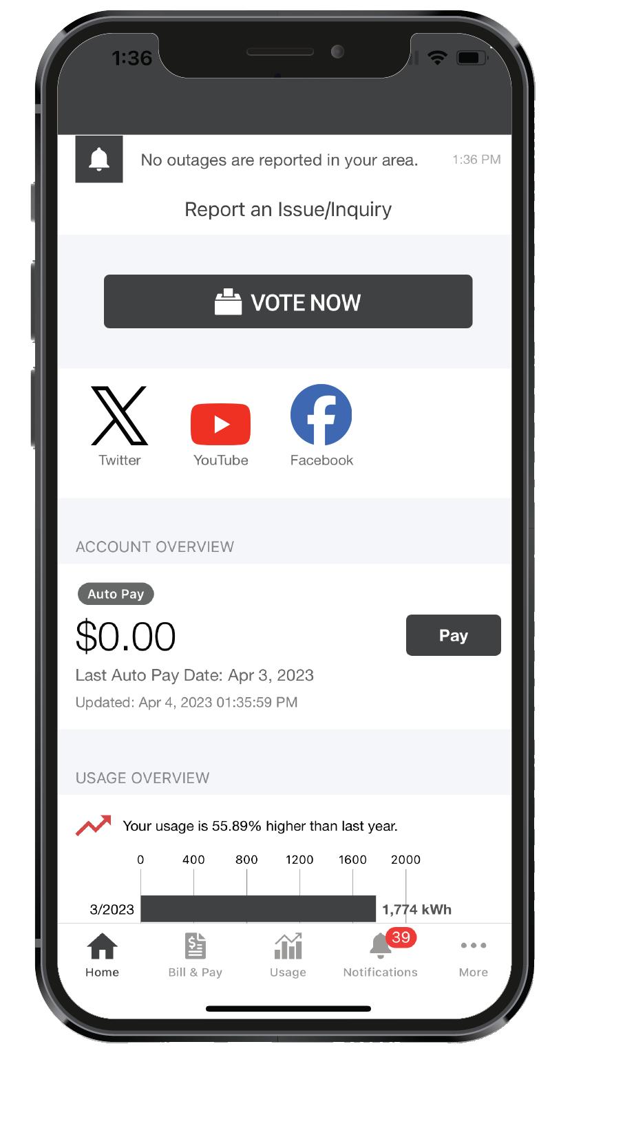 The SmartHub app is available on Android and Apple operating systems. Download from the app store for free, then log in using the same credentials you used when setting up your SmartHub account. Report power outages right from your computer or smartphone