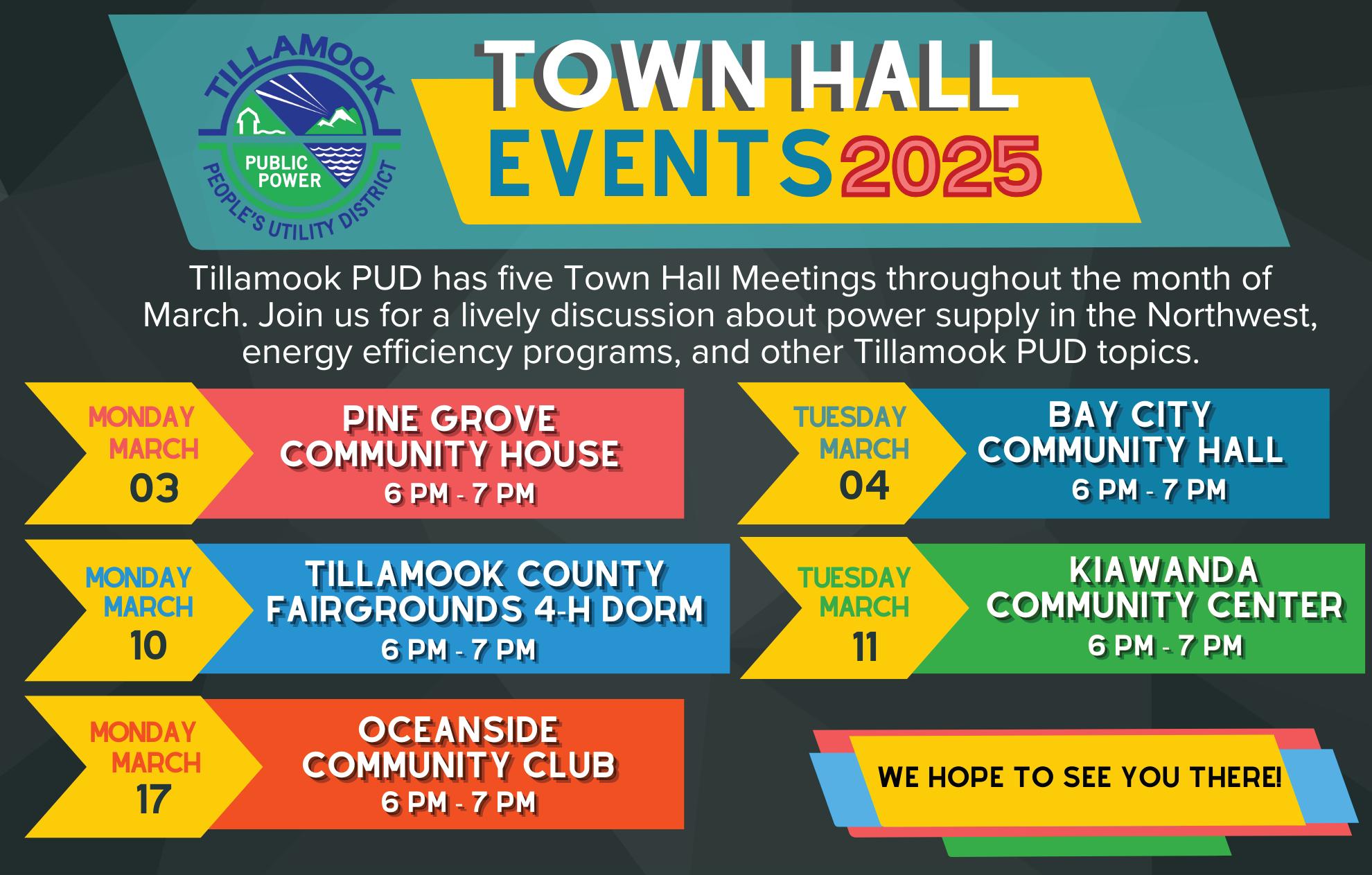Each Town Hall begins at 6 p.m. I will discuss power supply in the Northwest, including resource adequacy concerns, projects, energy-efficiency programs and other Tillamook PUD updates. There will be an opportunity to talk with us and ask any questions you may have. I look forward to visiting with everyone at these events.