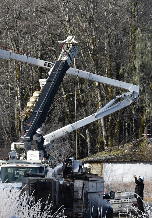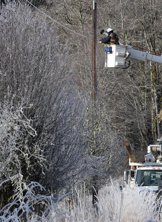 FROM LEFT: WOEC crews replace a power pole on a frosty January morning. PHOTO BY SCOTT LAIRD Line crews often come across downed trees and power poles. PHOTO BY ANDY LARSON A groundsman sets the new power pole in place. Replacing a pole while keeping the line energized is a complex job that requires safety controls, a thorough understanding of electrical theory and some hard physical labor. PHOTO BY SCOTT LAIRD