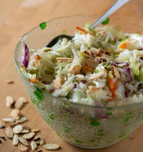 together the coleslaw mix, almonds and green onions in a large salad bowl.