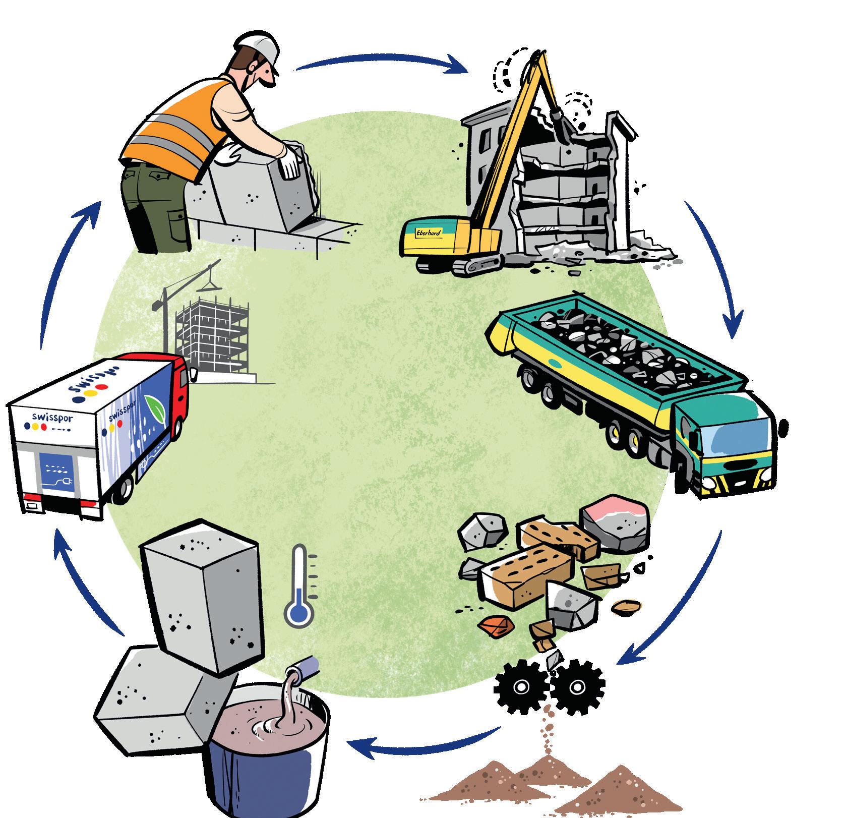 Pro Jahr fallen in der Schweiz rund 15 Millionen Tonnen an mineralischem Rückbaumaterial an, welches im ungünstigsten Fall auf einer dafür vorgesehenen Deponie entsorgt und somit dem Stoffkreislauf auf alle Ewigkeit entzogen wird. Diese Praxis steht im Widerspruch zum wachsenden Bedürfnis nach Nachhaltigkeit und Ressourcenschonung. Eberhard Unternehmungen und swisspor AG haben es sich zur Aufgabe gemacht, diesem Trend entgegenzuwirken. Durch die innovative Aufbereitung von Abbruchmaterial streben sie danach, neue, zirkuläre Rohstoffe und Bauprodukte für die lokale Bauindustrie zu schaffen.