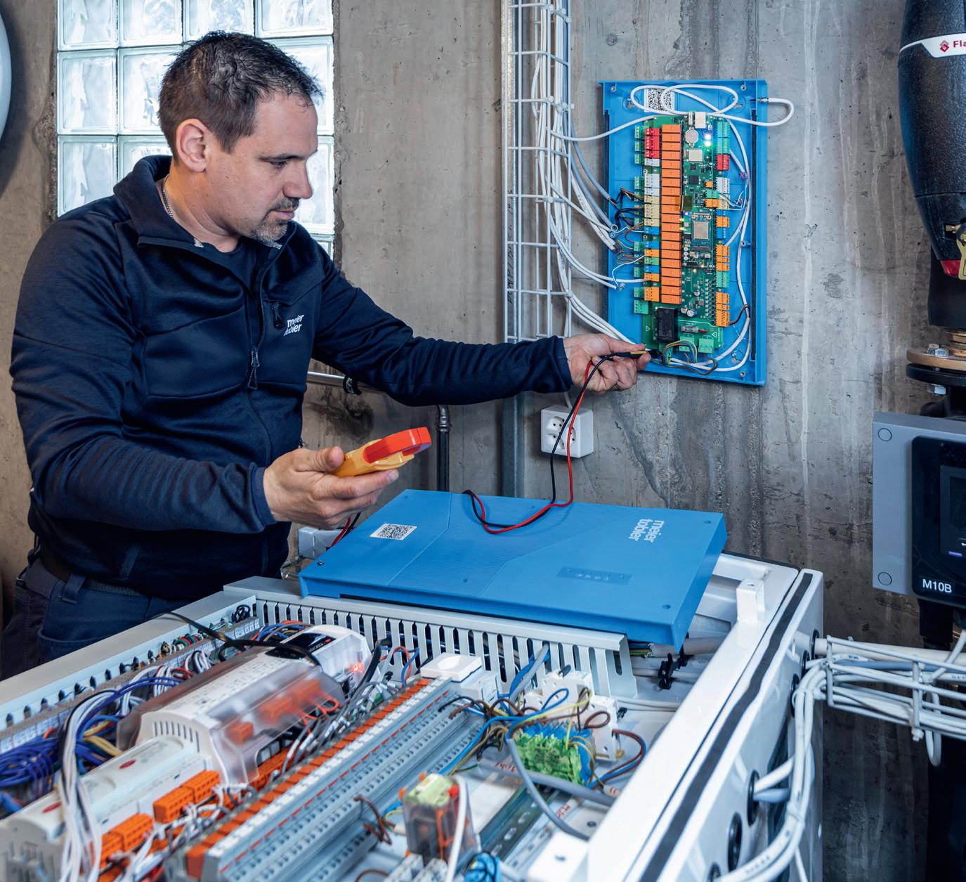 Die alte Heizung wurde stillgelegt, der Öltank abgebaut und eine mobile Übergangsheizung installiert. Die Hybridbox®, die intelligente Energiezentrale, welche das Ganze erst möglich macht, wurde im ursprünglichen Öltankraum eingebaut. Mit dem optimierten und patentierten Zusammenspiel der Wärmepumpe und einer Wärmekraftkoppelung mit Wärmerückgewinnung reagiert die Anlage flexibel auf Produktionskriterien