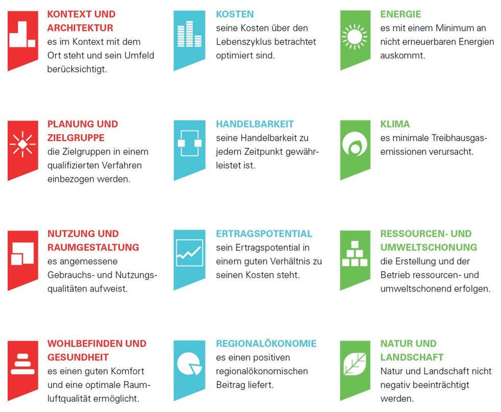 Während das nachhaltige Bauen die drei Dimensionen Gesellschaft, Wirtschaft und Umwelt berücksichtigt, sind Themen wie die Biodiversität, die Kreislaufwirtschaft und die Reduktion von Treibhausgasemissionen von besonderer Bedeutung.