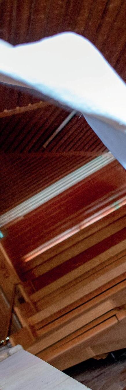 Der Innenausbau der Gondel ist vollständig aus Kiriholz gefertigt. Dieses eignet sich perfekt für den Saunabau und kann einen ganzen Strauss guter Eigenschaften vorweisen: Der Baum, auch als Paulownia bekannt, wächst sehr schnell, im Vergleich mit der Eiche rund zehnmal schneller. Sein Holz ist ein Leichtgewicht, was unter anderem Transport- und Energiekosten senkt. Gleichzeitig weist das Material eine gute Festigkeit sowie eine hohe Formstabilität auf, es ist dauerhaft und leicht zu verarbeiten. Das Holz für die Saunagondel stammt aus europäischer Produktion von Wegrow, einem deutschen Unternehmen, das seit der Gründung 2009 als Pionier im Bereich nachhaltigem Anbau von Kiriholz gilt und an diversen Standorten in Deutschland und Spanien Plantagen unterhält.
