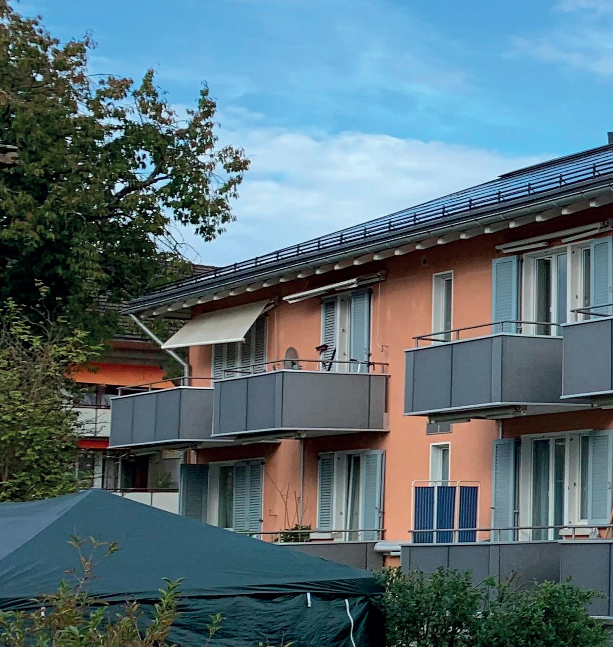 wie Wetter und Wärmebedarf. Danach ging es Schlag auf Schlag: Vorgefertigte Leitungen, vorfabrizierte Installationen wurden angebracht; dazu Dämmungen an Kellerdecken und der obersten Geschossdecke sowie ein stromerzeugender Dachbelag mit Photovoltaik-Modulen. Sogar die Balkonverkleidung wurde mit Photovoltaik-Modulen versehen und trägt so ebenfalls zur erfolgreichen Sanierung bei. Diese liefern im Winter bei niedrigem Sonnenstand mehr Energie als diejenigen auf dem Dach. Gespeichert wird der so produzierte Strom in einer Salzbatterie; ein Akku, der ohne kritische Metalle produziert wird.
