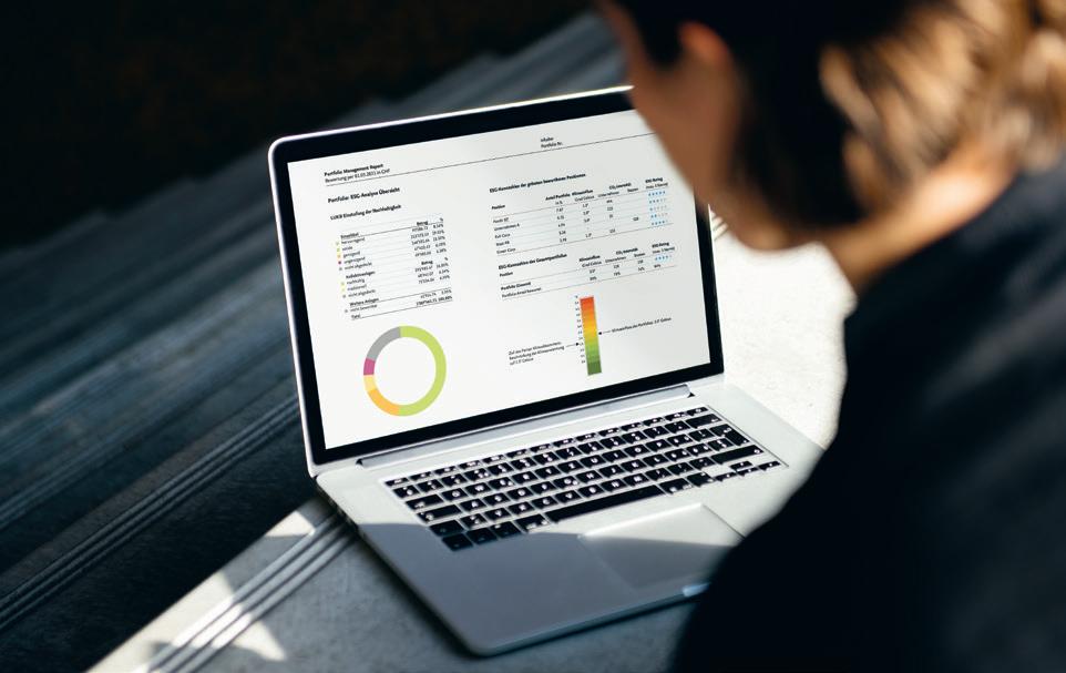 Anlegen im Einklang mit den eigenen Werten Anhand der Kennzahlen vergleichen wir das Portfolio der Kundin oder des Kun den mit einem nachhaltigen acrevis Re ferenzportfolio. Zudem entwickeln wir konkrete Empfehlungen, um das Portfo