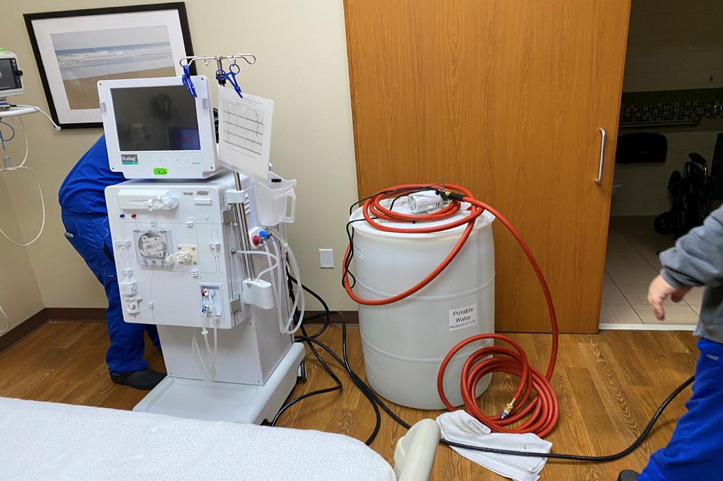 Another impact from the reduction in water pressure to our hospitals was to our inpatient dialysis unit. Dialysis equipment requires a certain minimum water pressure to function, and the water pressure in our buildings did not meet these minimums. With several patients in urgent need of dialysis, a collaborative effort was made to develop a stopgap measure to allow for emergency dialysis to be performed. Clinical Equipment Services, dialysis clinicians, and EHS worked together to create a temporary dialysis water source using a 55-gallon drum of potable water and an external water pump to increase water pressure to an acceptable level. Although water pressure levels in the building increased before this had to be implemented, UTMB now has an off the shelf method to provide emergency dialysis if we face future situations resulting in loss of water pressure.