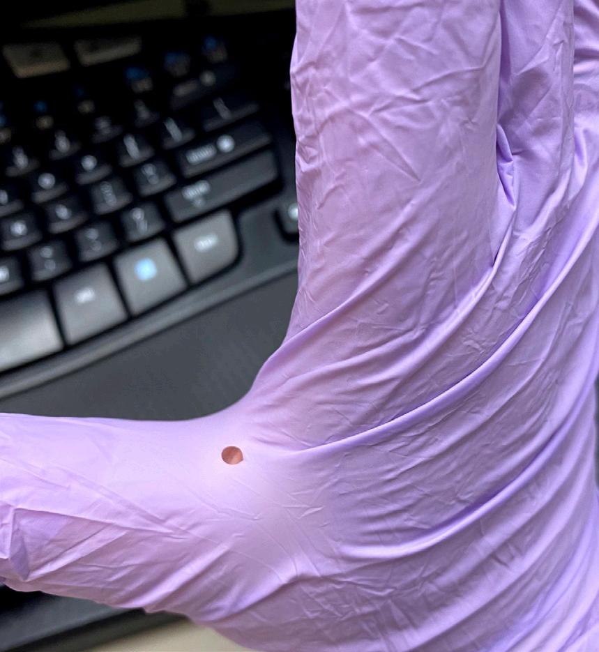 One example of a glove evaluated by EHS that failed catastrophically upon donning