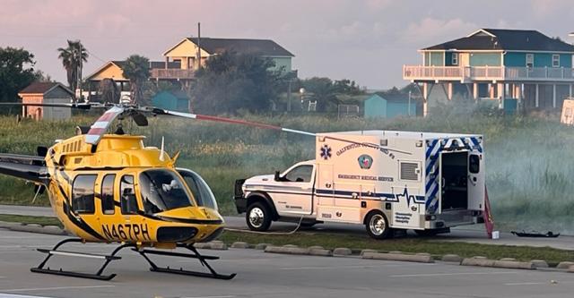 The medics of Galveston County Emergency Services District No. 2 (GCESD2) treated and stabilized the deputy for a quick helicopter ride across the water to the UTMB emergency room in Galveston.