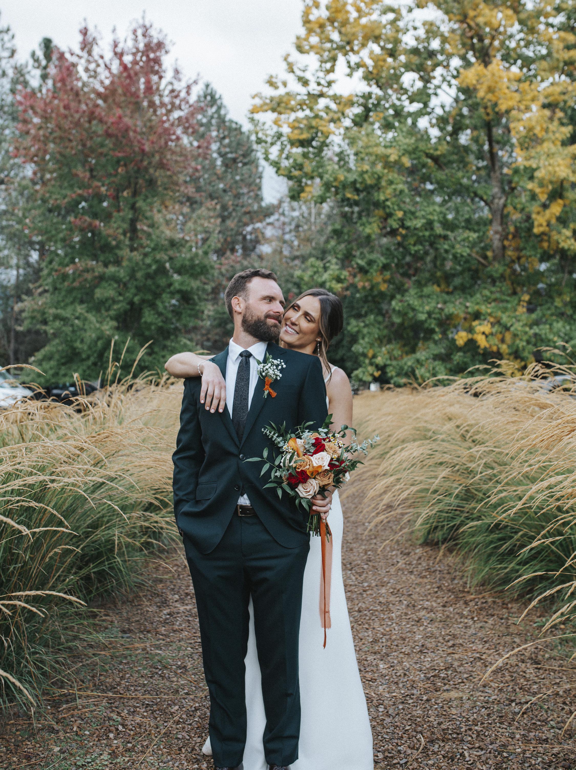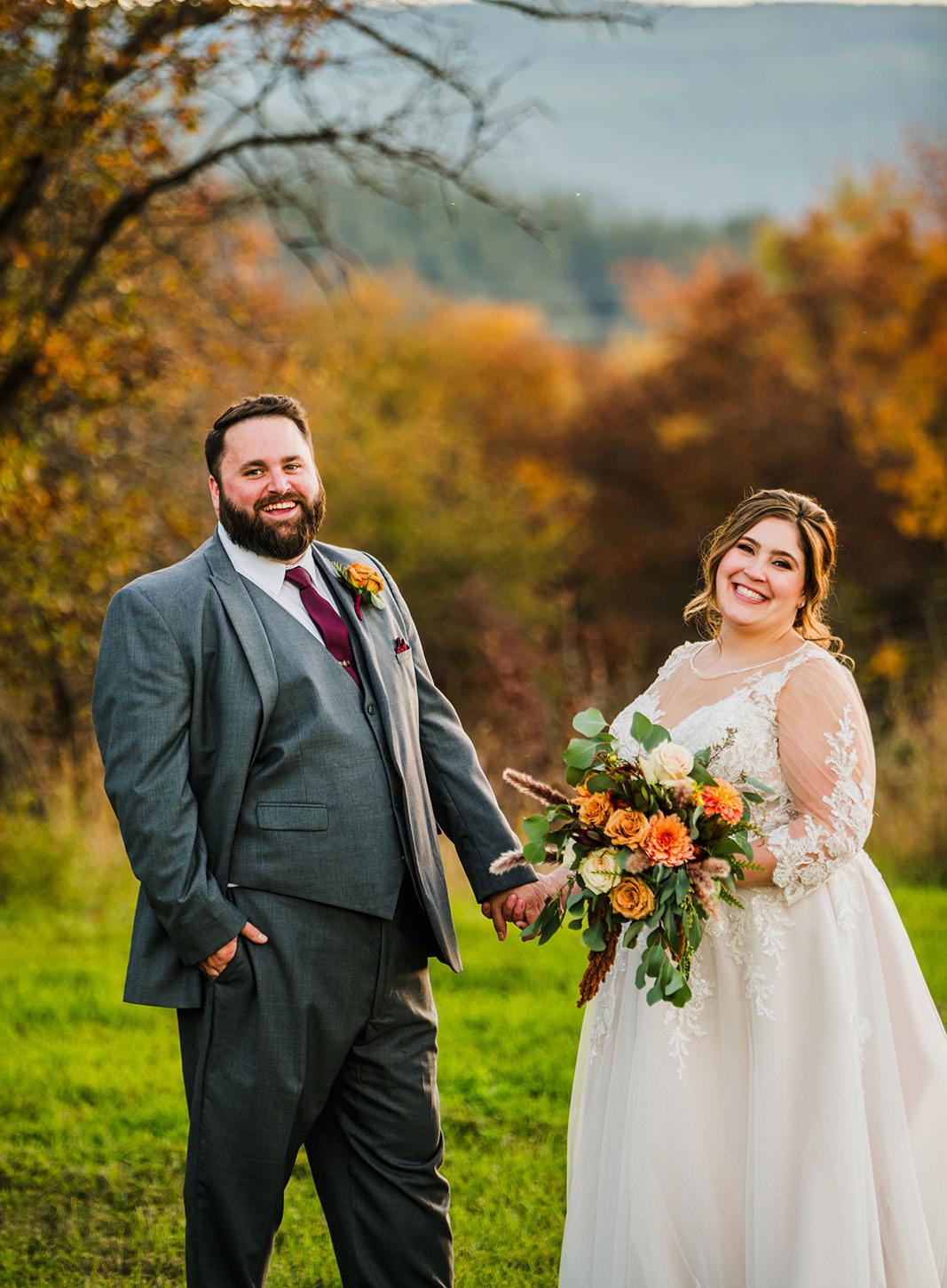 Definitely think season! We knew we wanted to get married in fall ecause it was our favorite season with the beautiful colors and minimal heat. Our wedding day turned out to be quite chilly and rainy but made for a gorgeous background and photos, all thanks to Three Sisters Photography. I wouldn’t change a thing!
