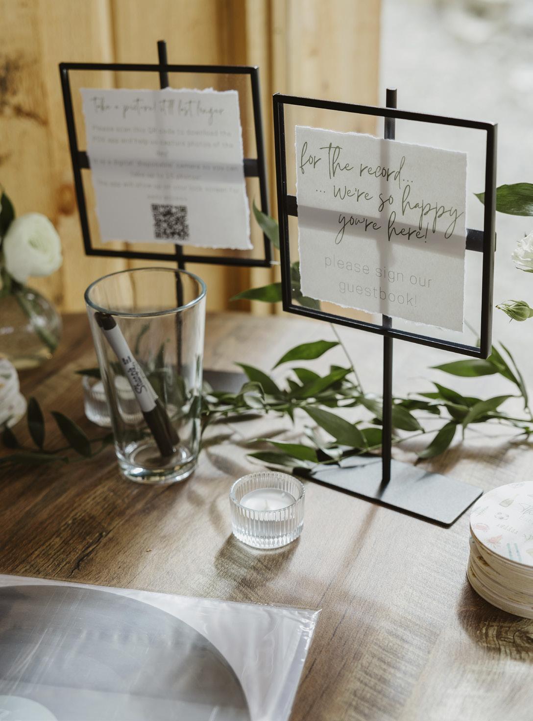 We made our guestbook an interactive experience. I ordered black blank pages and bought metallic sharpies for the guests to write with. We had two Instax cameras and also provided a bunch of stickers and Washi tape. We had an area set up next to the bar with a neon sign of our last name. We had two barrels on either side that had floral arrangements on top. We created an area where our guests could keep busy taking photos, signing and decorating the guestbook. I gave all of my bridesmaids Instax cameras with fun film as their gift. I encouraged them to take photos throughout the day.