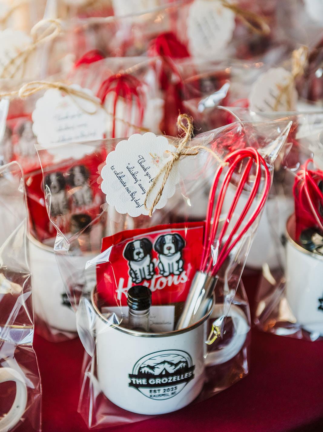 We really wanted to include the dogs because they are our family and couldn’t be there with us. We had a local artist from Seattle hand draw portraits of each dog. We framed them and brought them to Montana to be the center of our party favor table. We love to go camping and exploring so Kyle created a custom logo that we used throughout the wedding. We got custom camping cups made with our logo. Inside the cups contained Tim Horton’s Hot Chocolate, Heritage Cocoa Bomb Chocolate Whiskey, a mini whisk, custom stickers of the dogs, and the recipe for Belle and Blu’s Adventure Hot Chocolate. Kyle is Canadian so we wanted to include Tim Hortons. Heritage is the Distillery that we make our whiskey at. The whisk was my touch so the tag line could be “Thank you for whisking away to celebrate our big day.”