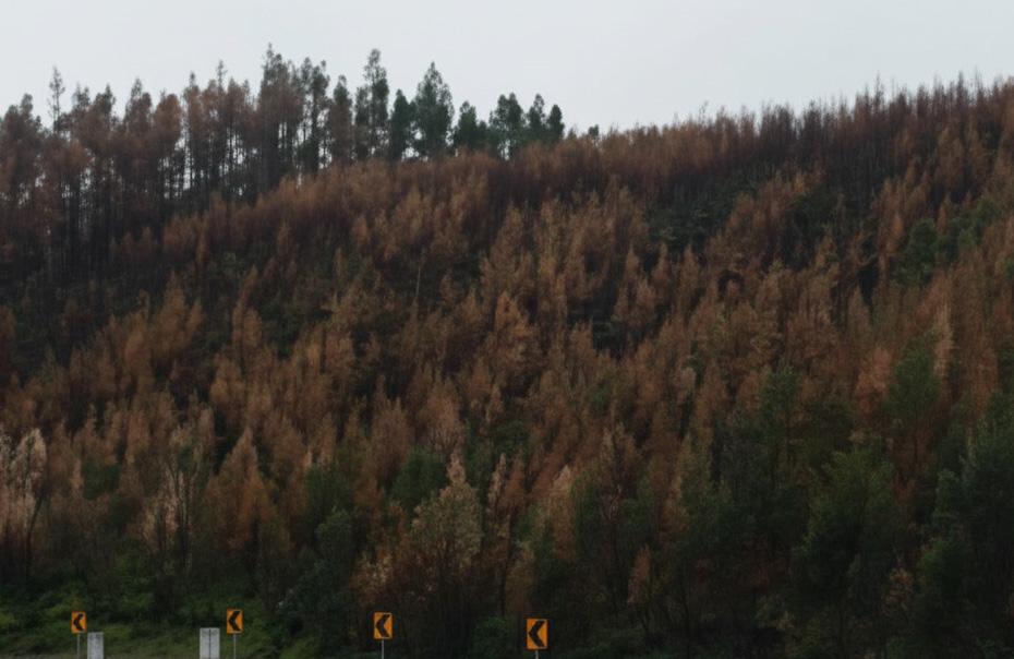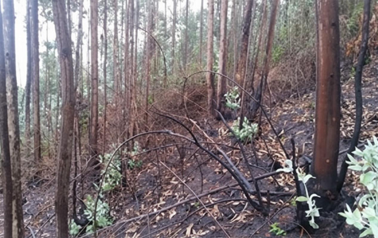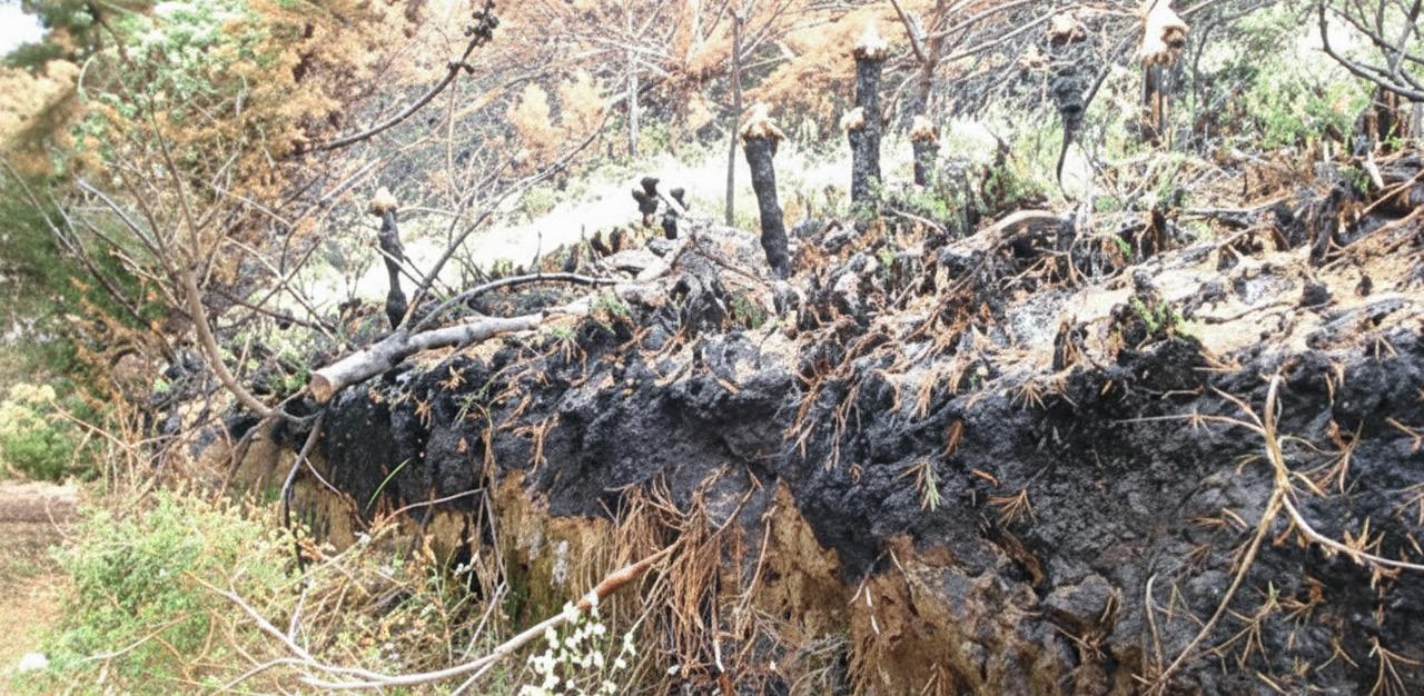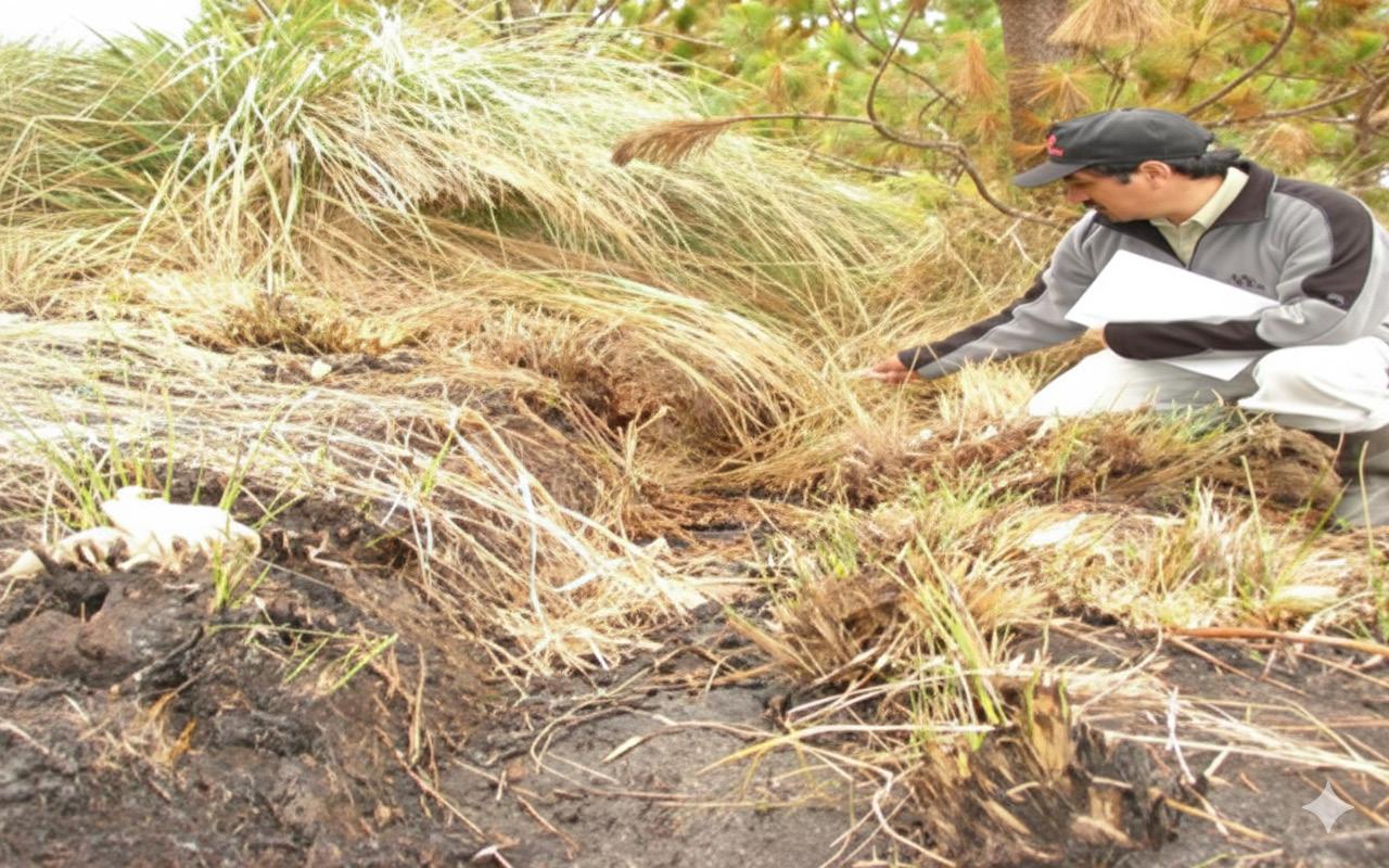 Comprende materiales como pastos secos, hojarascas, acículas de coníferas, humus, ramillas de árboles latifoliados, materia orgánica seca o en descomposición, frutos secos y tocones presentes en bosques en aprovechamiento o previamente aprovechados. Estos elementos constituyen una importante carga de combustible para los incendios forestales. Su impacto puede observarse en la Figura 1, que ilustra los efectos de incendios recurrentes registrados en 2023 en dos ubicaciones clave: junto al lago Yahuarcocha (a) y en el cantón Otavalo (b).
