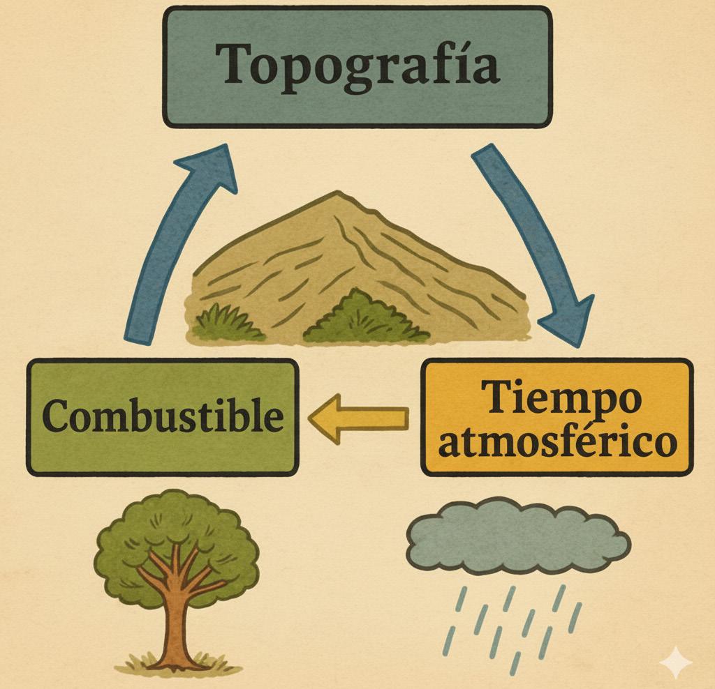 ● Triángulo de comportamiento del fuego: Herramienta didáctica en la cual cada lado de un triángulo equilátero se refiere a una de los tres principales componentes del entorno del fuego, responsables del comportamiento del mismo (meteorología, combustibles y topografía). También llamado triángulo del entorno del fuego.