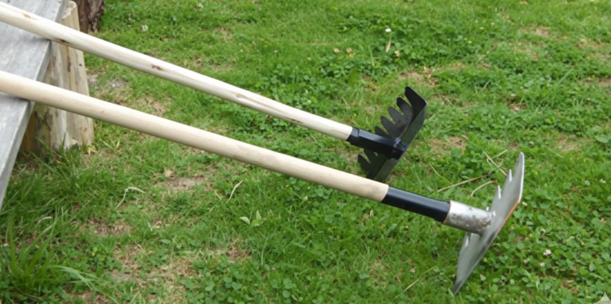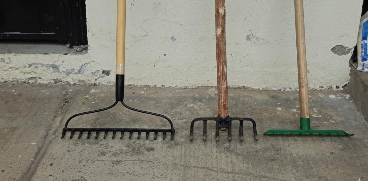 ● Rastrillo-azada: Herramienta compuesta de una placa plana de acero estampado con seis dientes gruesos en un lado y corte en el opuesto y provista de un casquillo de acero en su parte central, para enastar perpendicularmente a un mango de madera.
