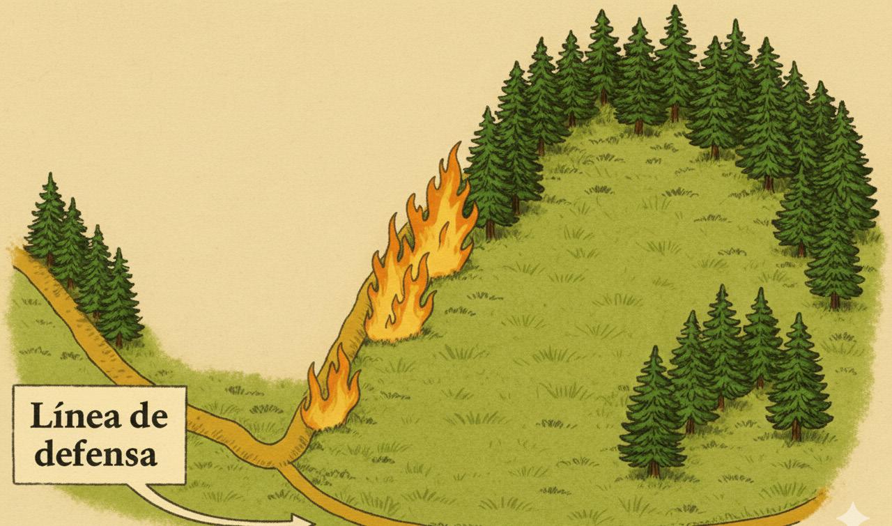 ● Línea de defensa: Es una faja estrecha o senda limpia de matorral que puede usarse para el movimiento por el monte y que, en caso de incendio, puede limpiarse rápidamente con herramientas manuales para apoyar un cortafuego.