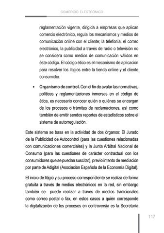reglamentación vigente, dirigida a empresas que aplican comercio electrónico, regula los mecanismos y medios de comunicación online con el cliente; la telefonía, el correo electrónico, la publicidad a través de radio o televisión no se considera como medios de comunicación válidos en éste código. El código ético es el mecanismo de aplicación para resolver los litigios entre la tienda online y el cliente consumidor. • Organismo de control. Con el fin de avalar las normativas, políticas y reglamentaciones inmersas en el código de ética, es necesario conocer quién o quiénes se encargan de los procesos o trámites de reclamaciones, así como también de emitir sendos reportes de estadísticos sobre el sistema de autorregulación. Este sistema se basa en la actividad de dos órganos: El Jurado de la Publicidad de Autocontrol (para las cuestiones relacionadas con comunicaciones comerciales) y la Junta Arbitral Nacional de Consumo (para las cuestiones de carácter contractual con los consumidores que se puedan suscitar), previo intento de mediación por parte de Adigital (Asociación Española de la Economía Digital). El inicio de litigio y su proceso correspondiente se realiza de forma gratuita a través de medios electrónicos en la red, sin embargo también se puede realizar a través de medios tradicionales como correo postal o fax, en estos casos a quién corresponde la digitalización de los procesos en controversia es la Secretaría 117