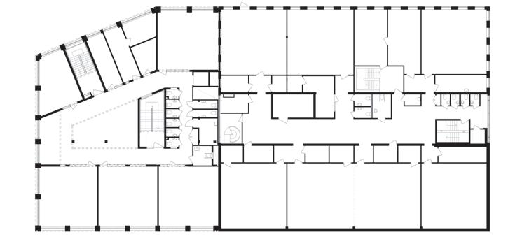 RITNINGEN VISAR DEN design för demontering som användes i Black and Whitebyggnaden. Alla anslutningar är bultade i stället för skruvade, vilket gör det enklare att ta isär elementen. Det upphöjda golvet vilar direkt på golvpanelen i KLträ och det finns inga våta ytor som golvavjämning i konstruktionen.