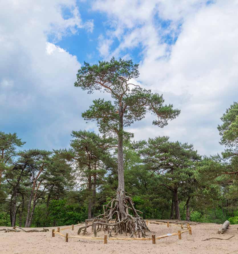 grilliger dan een den in het bos. De wortels lijken wel gemáákt om op te klimmen en te klauteren, maar toch is dat niet zo’n goed idee. Klimmen beschadigt de bast, waarna schimmels en insecten het hout aantasten. Daarom plaatste Utrechts Landschap een hek. Zodat we nóg honderd jaar van deze wandelende boom kunnen genieten.