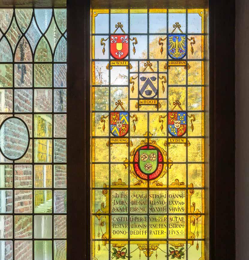 Er staat dat mr. Joanni Luden het raam cadeau kreeg, huius castelli per eum per actae restaurationis; ter herinnering aan de door hem verrichte restauratie aan het kasteel. Jan Luden, die zelf nooit op het kasteel woonde, herstelde het kasteel zoveel mogelijk in de, in zijn ogen, oorspronkelijke staat.