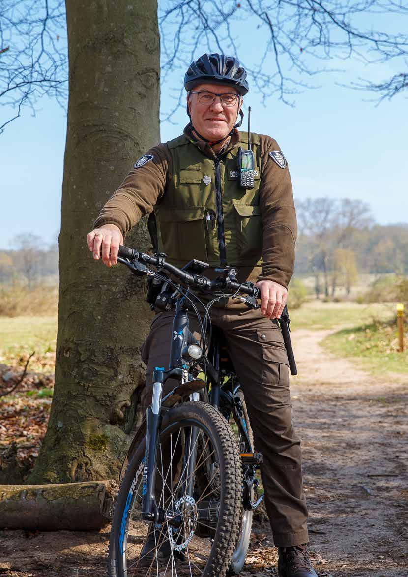Als je Nees van den Oosterkamp bezig ziet als boa (buitengewoon opsporingsambtenaar), zouden de woorden waakzaam en dienstbaar in je hoofd kunnen opkomen. Hij crosst over de glooiende vlaktes op zijn mountainbike, houdt de omgeving goed in de gaten en beantwoordt oproepen op zijn portofoon. Twee vrouwen die komen aanlopen over het pad dat door de grasvlakte slingert, worden hartelijk begroet. Nees maakt een praatje met ze over het mooie weer. Het is inderdaad een schitterende dag: de zon beschijnt de jonge loten aan de brem- en braamstruiken, een sleedoorn staat in volle bloei. In de verte grazen galloway-runderen.
