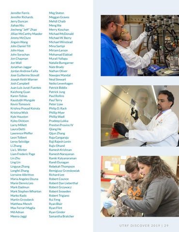 Meg Staton Meggan Graves Mehdi Chaib Meng Xie Merry Koschan Michael McDonald Michael W. Berry Michael Winstead Mina Sartipi Miriam Larson Mohamad Elabiad Murali Yallapu Natalie Bumgarner Nate Brady Nathan Oliver Nawajes Mandal Neal Stewart Neiko Levenhagen Patrick Biddix Patrick Jung Paul Rollins Paul Terry Peter Liaw Philip D. Rack Phillip Myer Phillip Wadl Pradeep Lukka Preston Provins IV Qiang He Qijun Zhang Raja Gangaraju Raji Rajesh Lenin Rajiv Dhand Ramesh Krishnan Ramesh Narayanan Ramki Kalyanaraman Randi Dunagan Rebekah Thompson Remigiusz Grzeskowiak Richard Lee Robert Counce Robert Dan Lieberthal Robert Grzywacz Robert Snowden Robert Trigiano Rui Feng Ryan Blair Ryan Flint Ryan Ginder Samantha Bratcher UTRF DISCOVER 2019 | 29