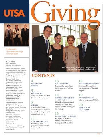 UTSA Giving 2011, Volume 3 Website: utsa.edu/giving UTSA Giving is published annually by The University of Texas at San Antonio for its donors and friends. The publication communicates the impact of philanthropy at the university. President: Ricardo Romo Vice President for University Advancement: Marjie M. French Associate Vice President for Advancement Services and Administration: Laura S. Murray Associate Vice President for Development: Eric C. Gentry Associate Vice President for Alumni Programs and Marketing: Jim Mickey Associate Vice President for Communications and Chief Communications Officer: David L. Gabler Managing Editor: Lisa Brunsvold Designer: Tom Palmer Contributors: Amanda Beck, Christi Fish, Lety Laurel, Heather Locke Marlow, Lorna Stafford Photographers: Patrick Ray Dunn and Mark McClendon Office of the Vice President for University Advancement One UTSA Circle, Main Building San Antonio, TX 78249 (210) 458-4131 giving@utsa.edu If you prefer to receive UTSA Giving online only, please send a message to giving@utsa.edu
