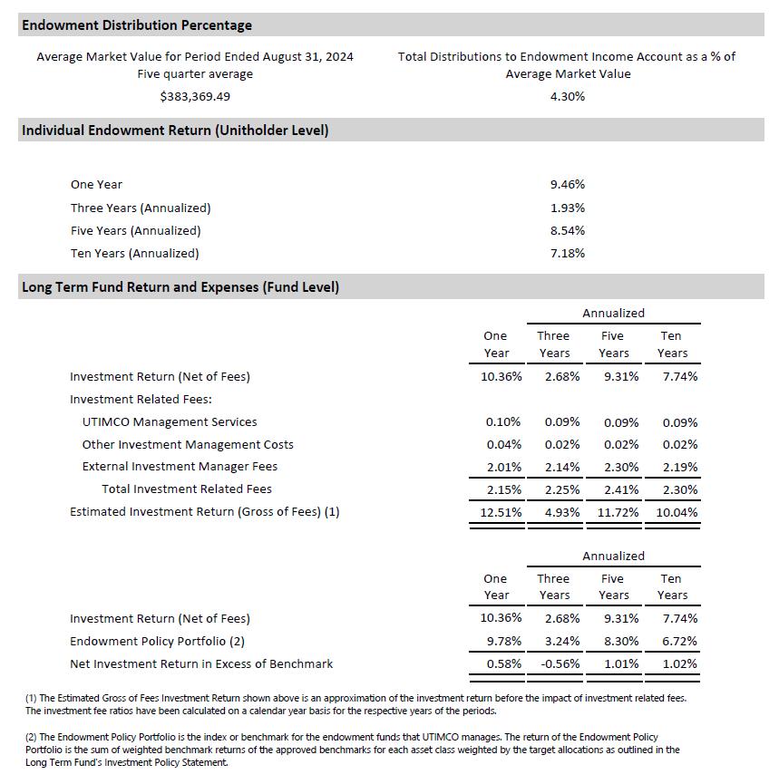 Endowment’s return is calculated individually for the twelve month periods ended August 31, 2015, 2016, 2017, 2018, 2019, 2020, 2021, 2022, 2023, and 2024 and the results are geometrically linked to provide a ten year annualized return. The total return computes the change in the endowment’s investment value, including capital appreciation (realized and unrealized gains and losses), investment income net of all investment fees and allocations expressed as a percentage of the endowment’s market value at the beginning of the period.