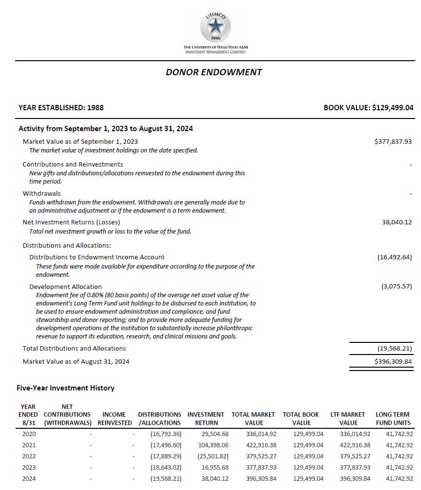 Endowment’s return is calculated individually for the twelve month periods ended August 31, 2020, 2021, 2022, 2023, and 2024 and the results are geometrically linked to provide a five year annualized return. The total return computes the change in the endowment’s investment value, including capital appreciation (realized and unrealized gains and losses), investment income net of all investment fees and allocations expressed as a percentage of the endowment’s market value at the beginning of the period.