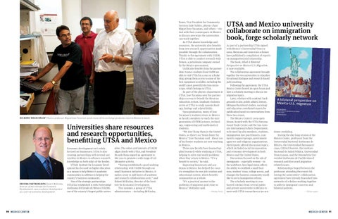 Economic development isn’t solely focused on businesses; UTSA is also creating partnerships with several universities in Mexico to advance research knowledge on both sides of the border. UTSA’s Institute for Economic Development has focused on higher education as a means to help Mexico’s academic communities in addition to helping the country’s business community. One of the strategic partnerships UTSA has established is with Universidad Autónoma del Estado de México (UAEM), one of the country’s largest public univer-