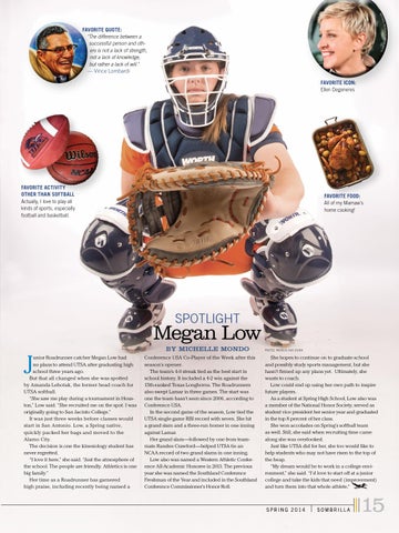 By MIchelle MOndo Conference USA Co-Player of the Week after this season’s opener. The team’s 4-0 streak tied as the best start in school history. It included a 4-2 win against the 15th-ranked Texas Longhorns. The Roadrunners also swept Lamar in three games. The start was one the team hasn’t seen since 2006, according to Conference USA. In the second game of the season, Low tied the UTSA single-game RBI record with seven. She hit a grand slam and a three-run homer in one inning against Lamar. Her grand slam—followed by one from teammate Randee Crawford—helped UTSA tie an NCAA record of two grand slams in one inning. Low also was named a Western Athletic Conference All-Academic Honoree in 2013. The previous year she was named the Southland Conference Freshman of the Year and included in the Southland Conference Commissioner’s Honor Roll.