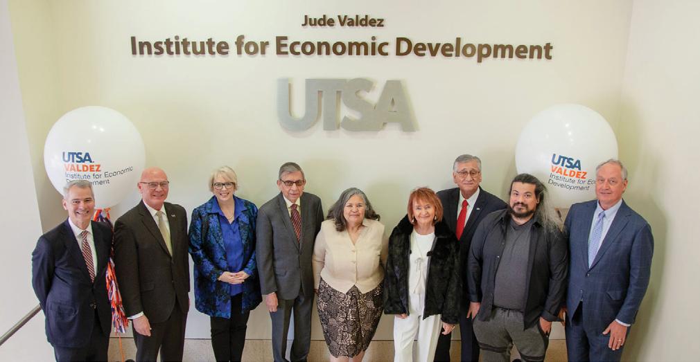 Pictured above, left to right: Karl Miller-Lugo, vice president for advancement and alumni engagement; Rod McSherry, associate vice president for innovation and economic development; JoAnn Browning, interim vice president for research; Jude Valdez with his partner, Norma Cantu; Tita Stasney, Jude’s sister; Albert Salgado, assistant vice president for small business & community development; Nicholas Valdez, Jude’s son; and Taylor Eighmy, president UTSA