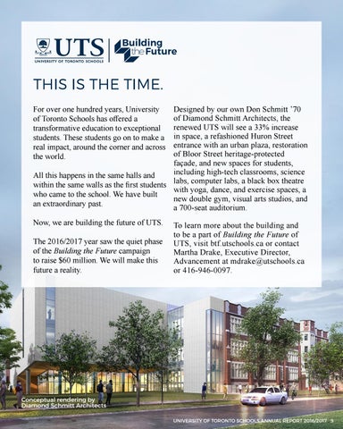 Designed by our own Don Schmitt ’70 of Diamond Schmitt Architects, the renewed UTS will see a 33% increase in space, a refashioned Huron Street entrance with an urban plaza, restoration of Bloor Street heritage-protected façade, and new spaces for students, including high-tech classrooms, science All this happens in the same halls and labs, computer labs, a black box theatre within the same walls as the first students with yoga, dance, and exercise spaces, a who came to the school. We have built new double gym, visual arts studios, and an extraordinary past. a 700-seat auditorium. Now, we are building the future of UTS. The 2016/2017 year saw the quiet phase of the Building the Future campaign to raise $60 million. We will make this future a reality.