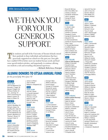 Alumni donors to UTSAA Annual Fund for the period July ’06 to June ’07 l1929–35l Total: $615 John M. Magwood ’29 Kenneth C. Legge ’30 Benson T. Rogers ’30 W. Bruce Charles ’32 Ian L. Jennings ’33 John D. Armstrong ’35 Robert F. Grieve ’35 Peter G. O’Brian ’35