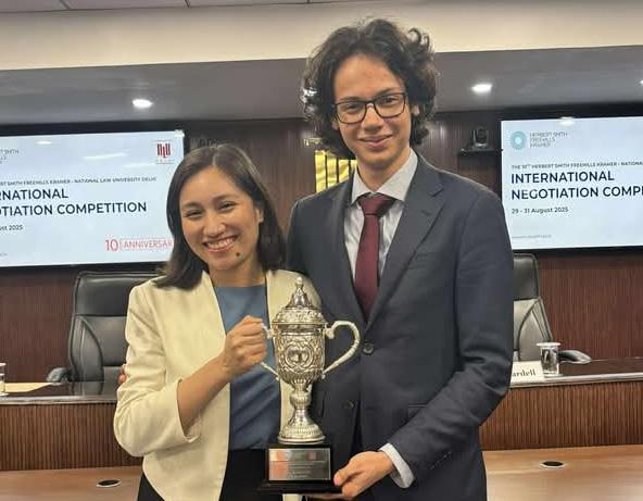 "After competing in several intervarsity negotiation competitions through the LSS, we were selected in 2025 to compete in the invite-only 10th Herbert Smith Freehills Kramer NLU Delhi International Negotiation Competition, the only international negotiation competition offered by the LSS. The competition focused on complex, highly technical scenarios, such as cross-border mergers and acquisitions, covering issues such as intellectual property, corporate governance, competition, regulatory compliance, and employment law. Scenarios drafted by HSFK lawyers required strong subject knowledge and encouraged creative, commercially focused solutions. The competition hosted 34 teams from around the world, including India, the UK, Singapore, Sri Lanka, and Australia, and was judged exclusively by experienced legal practitioners and academics.