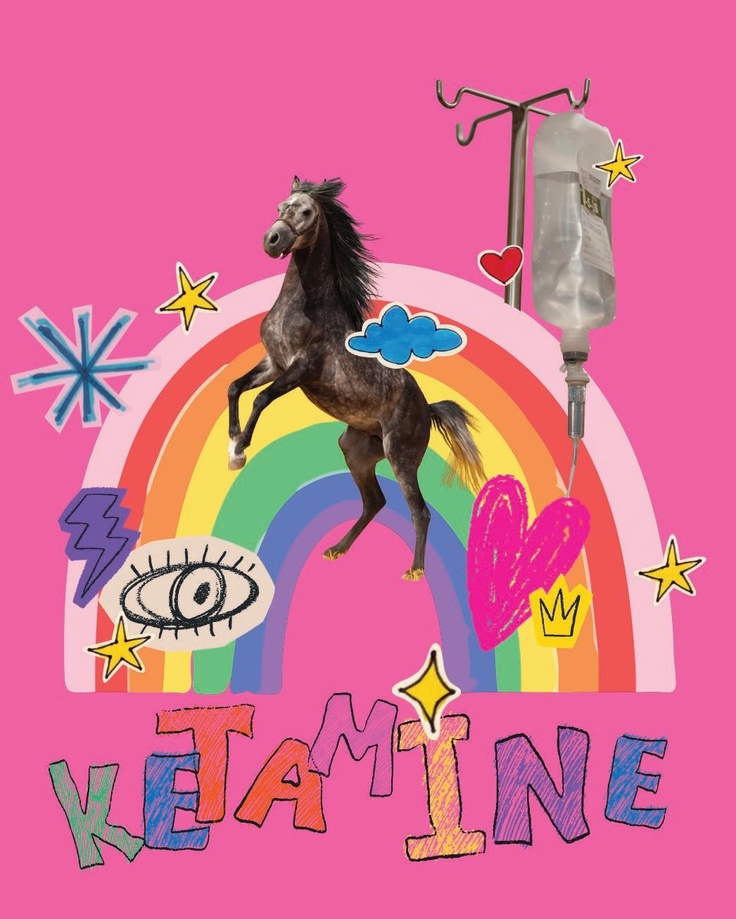 The DEA describes ketamine as a “dissociative anesthetic that has some hallucinogenic effects.” In the 70s, it was marketed as a short-acting anesthetic, safe to use on both humans and animals (hence the horse tranquilizer association), but was officially classified as a Schedule III non-narcotic in 1999. High doses cause sedation, and lower doses make you trip. Common tripping experiences include “K-land” — the desired, euphoric, “I can’t feel my face,” feeling. Heavier usage can put you in a “K-hole,” an out-ofbody, intensely hallucinogenic and often paralyzing state.